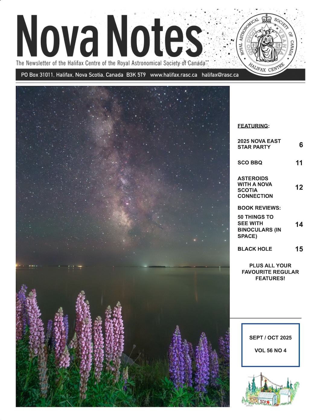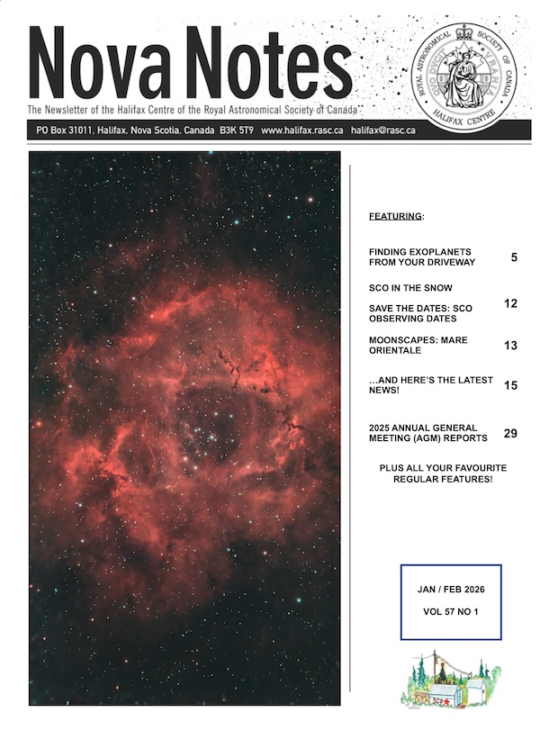 The Halifax Centre publishes a newsletter, Nova Notes, five times a year. It contains articles, meeting reports, astrophotographs and astro-sketches, and other Centre information. It is published online in colour.